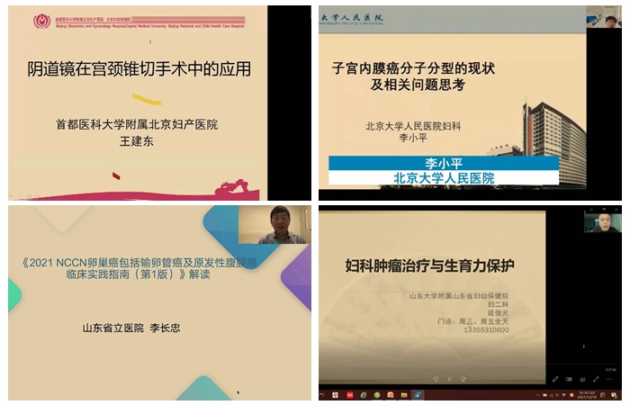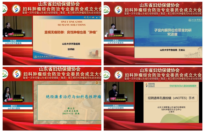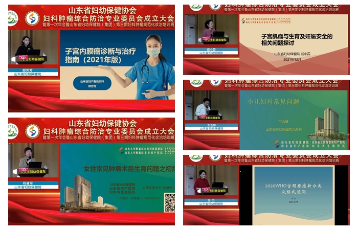 成立大会结束后,来自省内、外的各位专家通过线上、线下相结合的方式给与会人员带来精彩授课。首都医科大学附属北京妇产医院王建东教授、北京大学人民医院李小平教授、山东省立医院李长忠主任、山东省妇幼保健院延俊元主任分别就题目为《阴道镜在宫颈锥切手术中的应用》、《子宫内膜癌分子分型的现状及相关问题思考》、《<2021NCCN卵巢癌包括输卵管癌及原发性腹膜癌临床实践指南(第1版)>解读》、《妇科肿瘤治疗与生育力保护》进行了线上授课;山东大学齐鲁医院张师前教授、王国云教授、山东省立医院穆玉兰教授、山东省妇幼保健院郎芳芳主任、杨慧军主任、张杰主任、戚小霞主任、王继东主任、王合锋主任分别就题目为《重视无瘤防御:良性肿瘤也是“肿瘤”》、《子宫内膜异位症恶变研究进展》、《绝经激素治疗与妇科恶性肿瘤》、《子宫内膜癌诊断与治疗指南(2021年版)》、《女性常见肿瘤术后生育问题之初探》、《2020WHO宫颈腺癌新分类及模式浸润》、《子宫肌瘤与生育及妊娠安全的相关问题探讨》、《经阴道单孔腹腔镜(vNOTES)手术》、《小儿妇科常见问题》进行了线下授课。