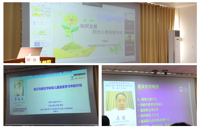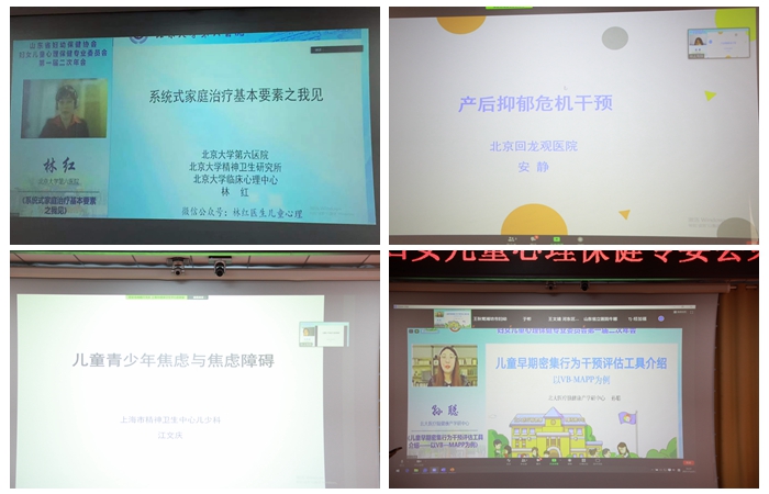 开幕式后,来自省内、外的专家通过线上、线下相结合的方式给与会人员带来精彩授课。中国疾病预防控制中心妇幼保健中心郑睿敏博士、上海交大医学院附属上海儿童医学中心章依文主任医师、马骏博士、北京大学第六医院林红博士、北京回龙观医院安静主任、上海市精神卫生中心江文庆博士、北大医疗脑健康产学研中心孙聪副总监分别就题目为《如何发展妇女心理保健专科》、《执行功能在学龄前儿童语言学习中的作用》、《遗尿症的药物&行为治疗》、《系统式家庭治疗基本要素之我见》、《产后抑郁危机干预》、《儿童青少年焦虑与焦虑障碍》、《儿童早期密集行为干预评估工具介绍——以VB—MAPP为例》进行了线上授课:山东省妇幼保健院刘明花主任、心理咨询师罗颖分别就题目为《儿童性心理发展和性教育》、《孕产妇的心理筛查与评估》进行了线下授课。