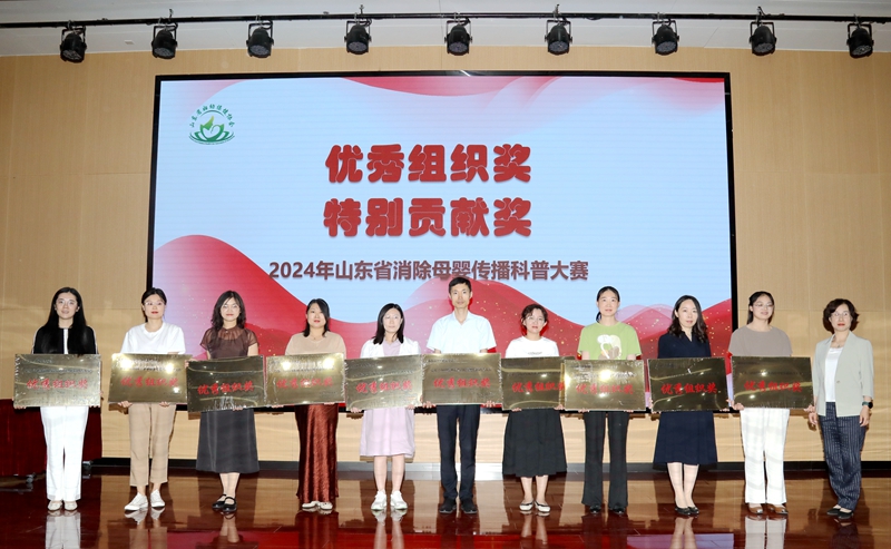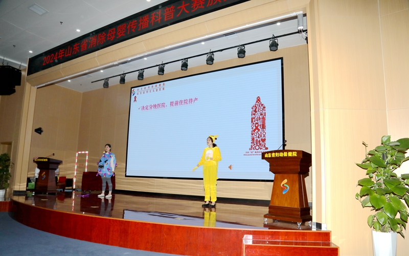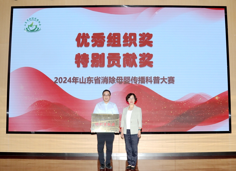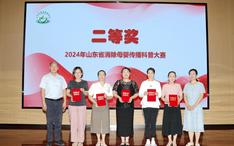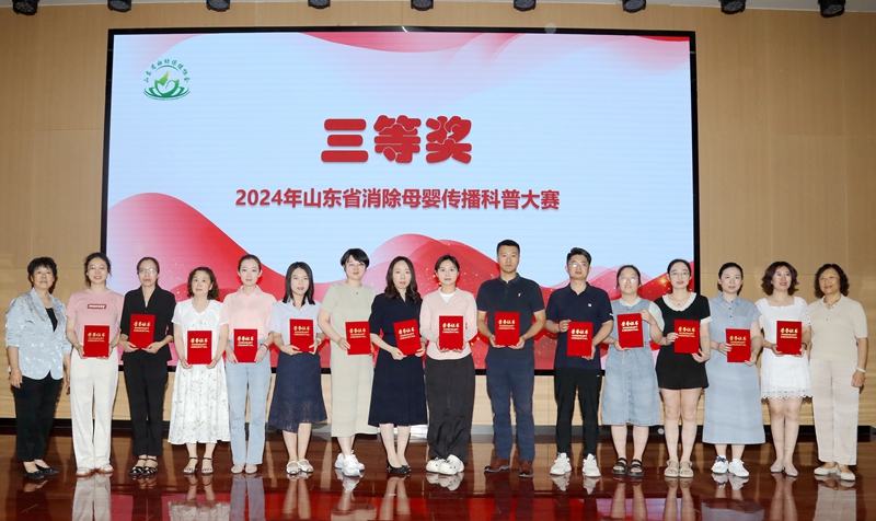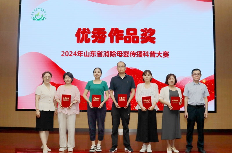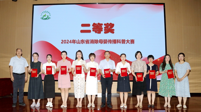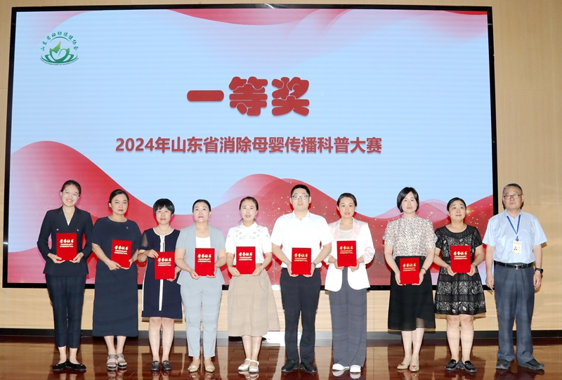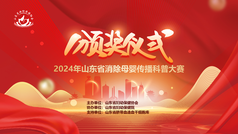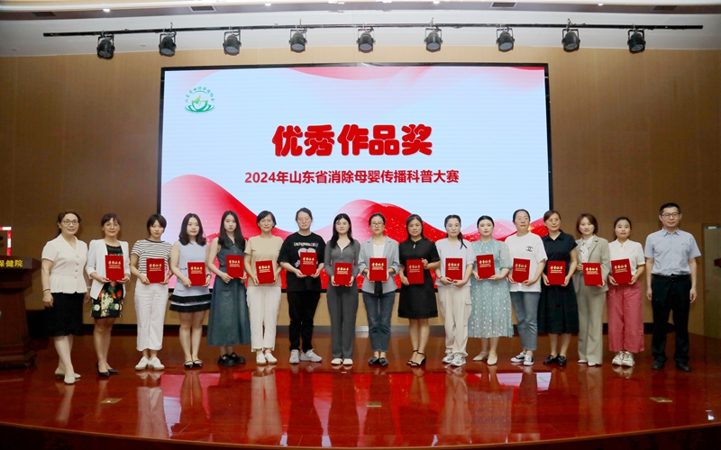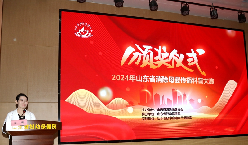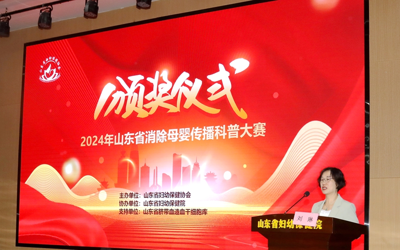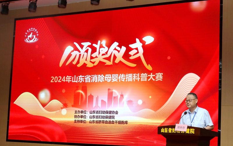 2024年6月27日,在山东省卫生健康委妇幼健康处的指导下,由山东省妇幼保健协会主办,山东省妇幼保健院(山东省妇女儿童医院)协办,山东省脐带血造血干细胞库支持的“2024年山东省消除母婴传播科普大赛颁奖仪式”在济南举办。山东省卫生健康委妇幼健康处处长刘琳、副处长马菲菲,山东省妇幼保健协会常务副会长、山东省妇幼保健院党委书记郑世存,山东省妇幼保健协会副会长樊云井,秘书长高亚莉,副秘书长周凤荣、许观照、安祥美,山东省妇幼保健院妇幼健康发展研究中心主任、社会保健科高杰主任,山东省脐血库主任楚中华,原山东省妇幼保健院副院长李家宁及各级妇幼保健机构、助产医疗机构的获奖者,参演嘉宾出席颁奖仪式。颁奖仪式由山东省妇幼保健院营养科毛璐主持。