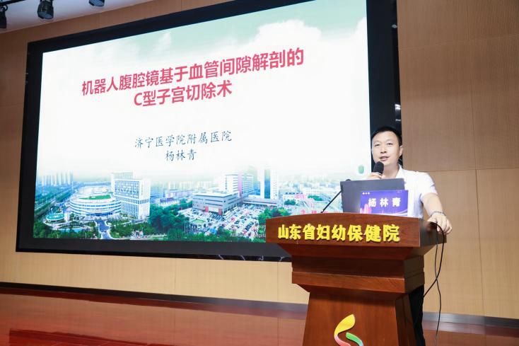 济宁医学院附属医院杨林青主任授课: 《机器人腹腔镜基于血管间隙解剖的 C 型子宫切除术》。